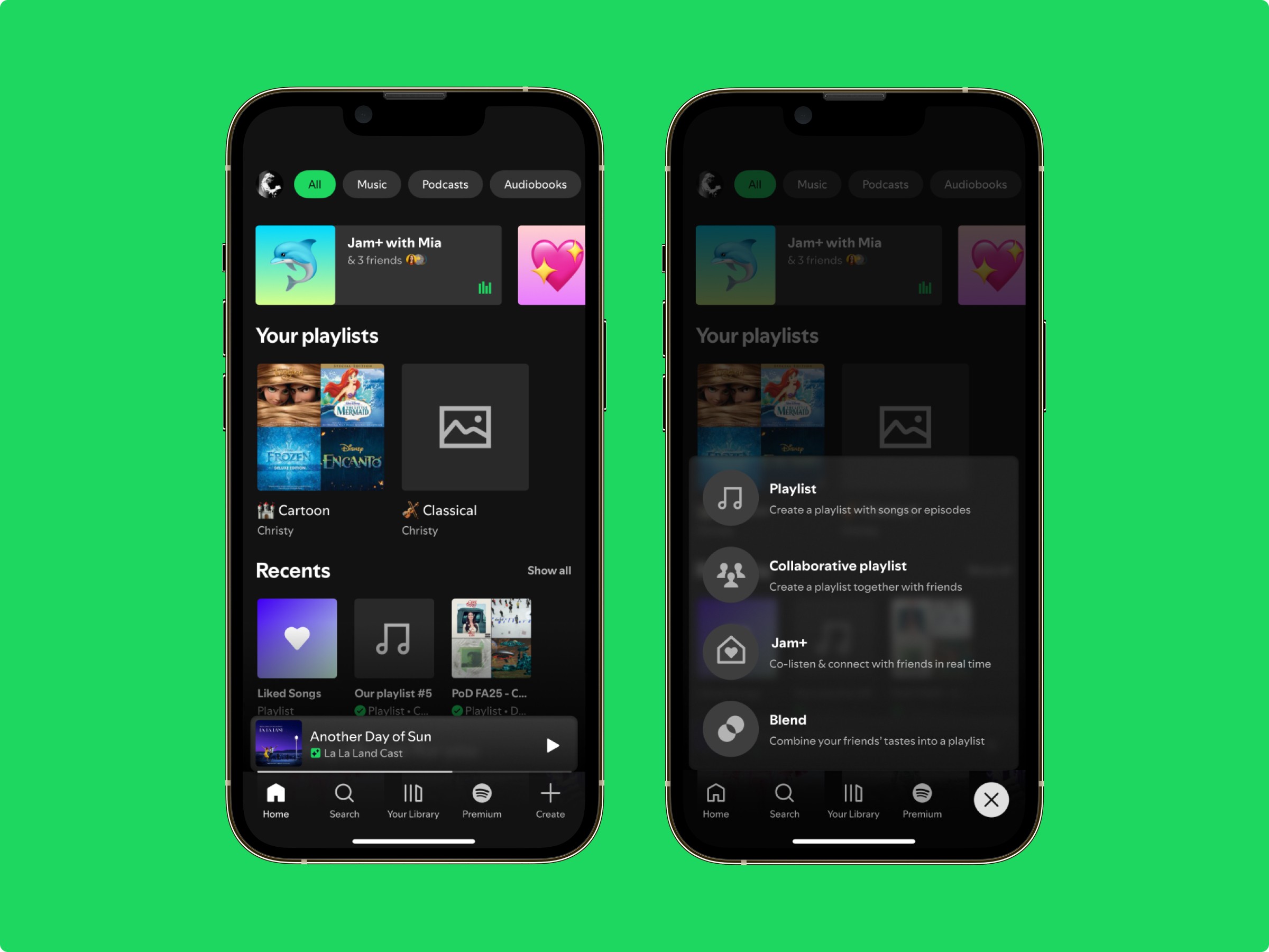 Spotify’s Jam entry point is hidden inside the playback screen. Home “+ Create” button makes session creation faster and intuitive.