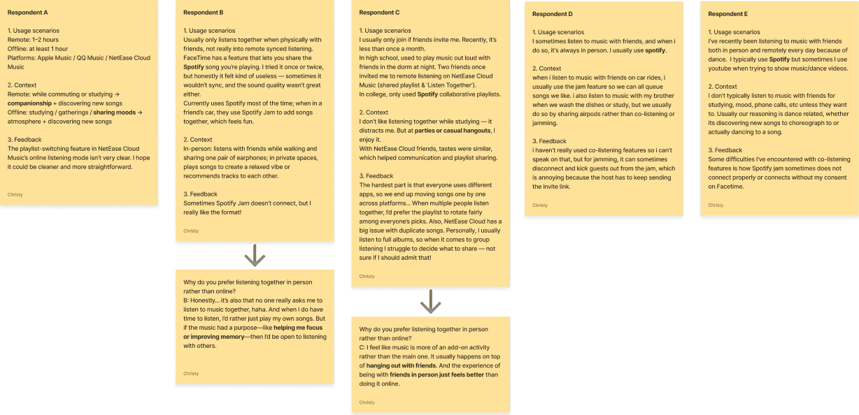 I conducted 5 user interviews, including friends from different countries to capture cultural differences, and supplemented these with online reviews of existing co-listening and jamming products to reduce bias from geography, social circles, or cultural background.